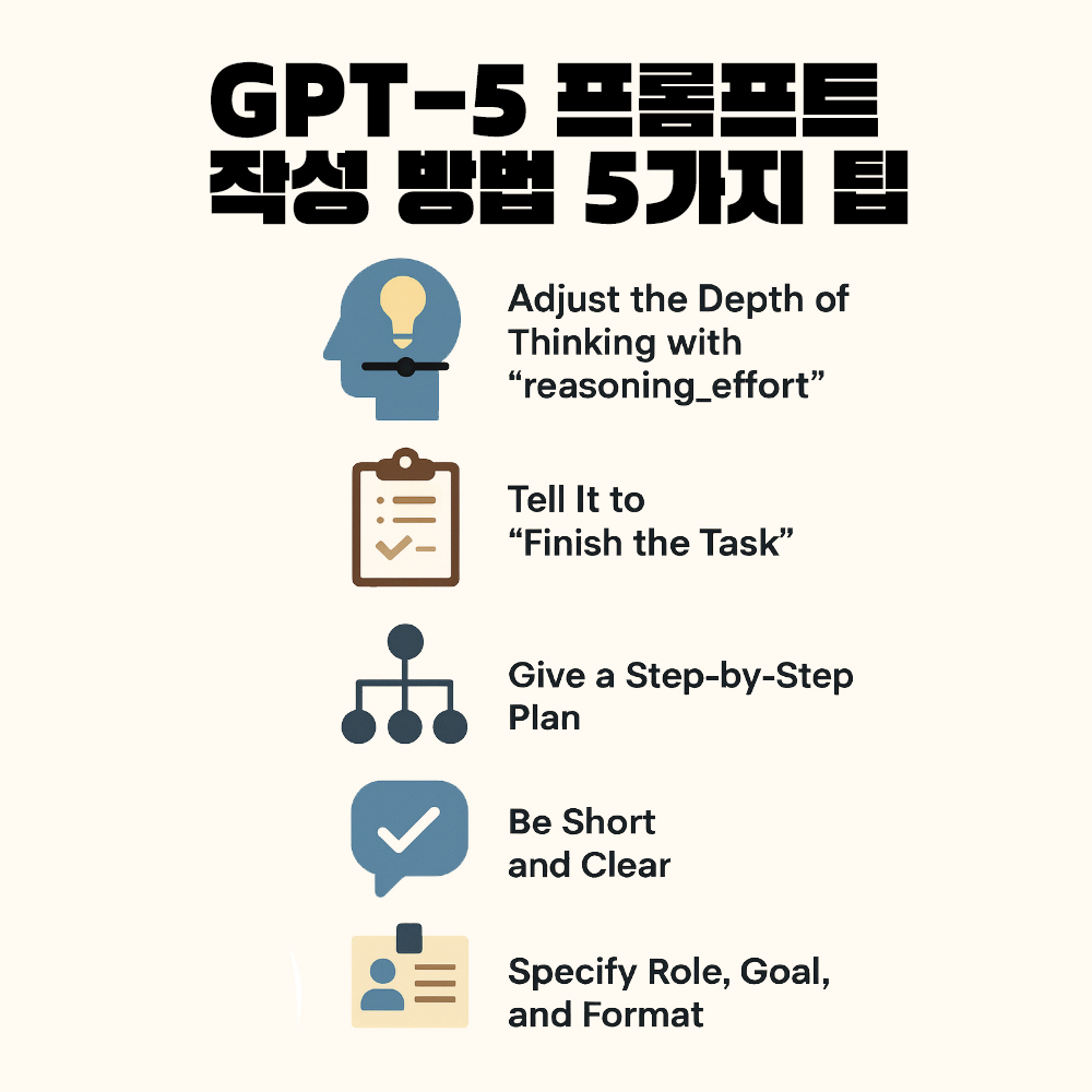 The newly released GPT-5 boasts far more powerful performance than previous models. However, no matter how advanced an AI is, the quality of its output can be night and day depending on how we ask our questions. If you want to move beyond simple answers and get in-depth, high-quality results as if they were written by an expert in the field, remember the following five prompt strategies. They will be your secret weapon to dramatically improve your ability to use GPT-5. - GPT-5에서 좋은 결과를 얻는 프롬프트 작성법 5가지 핵심 팁